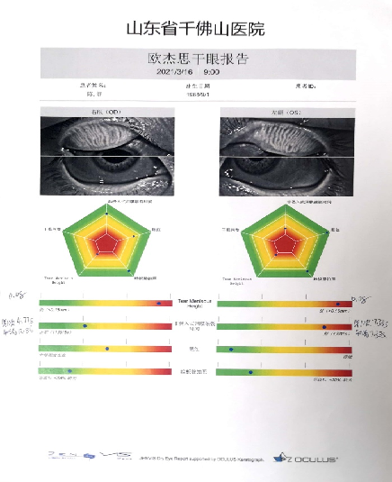 干眼检查:右眼泪河高度0.08mm,非侵入式泪膜破裂时间12.86s,眼红中等程度充血,睑板腺拍照1级;左眼泪河高度0.08mm,非侵入式泪膜破裂时间7.33s,眼红普通,睑板腺拍照1级。